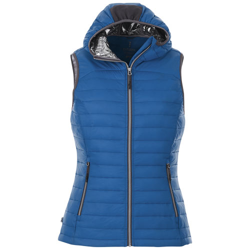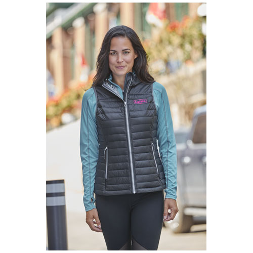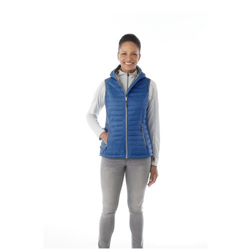 Damski ocieplany bezrękawnik Junction. Mieści się w dolnej lewej kieszeni.Port wyprowadzający media z miejscem poprowadzenia kabla.Elastyczny ściągacz w kapturze i w pasie ze stoperami.Elastyczne sciągacze w kontrastowym kolorze.Szwy kształtujące sylwetkę oraz zwężana talia.Zamek błyskawiczny na froncie.Przednia kieszeń na zamek.Pętelka na wieszak.Metka wdrukowana transferem dla lepszego komfortu. Tkanina 100% Nylon dull cire, nieprzemakalna i nieprzepuszczająca puchu. Sztuczny puch 100% poliester. 38 g/m².