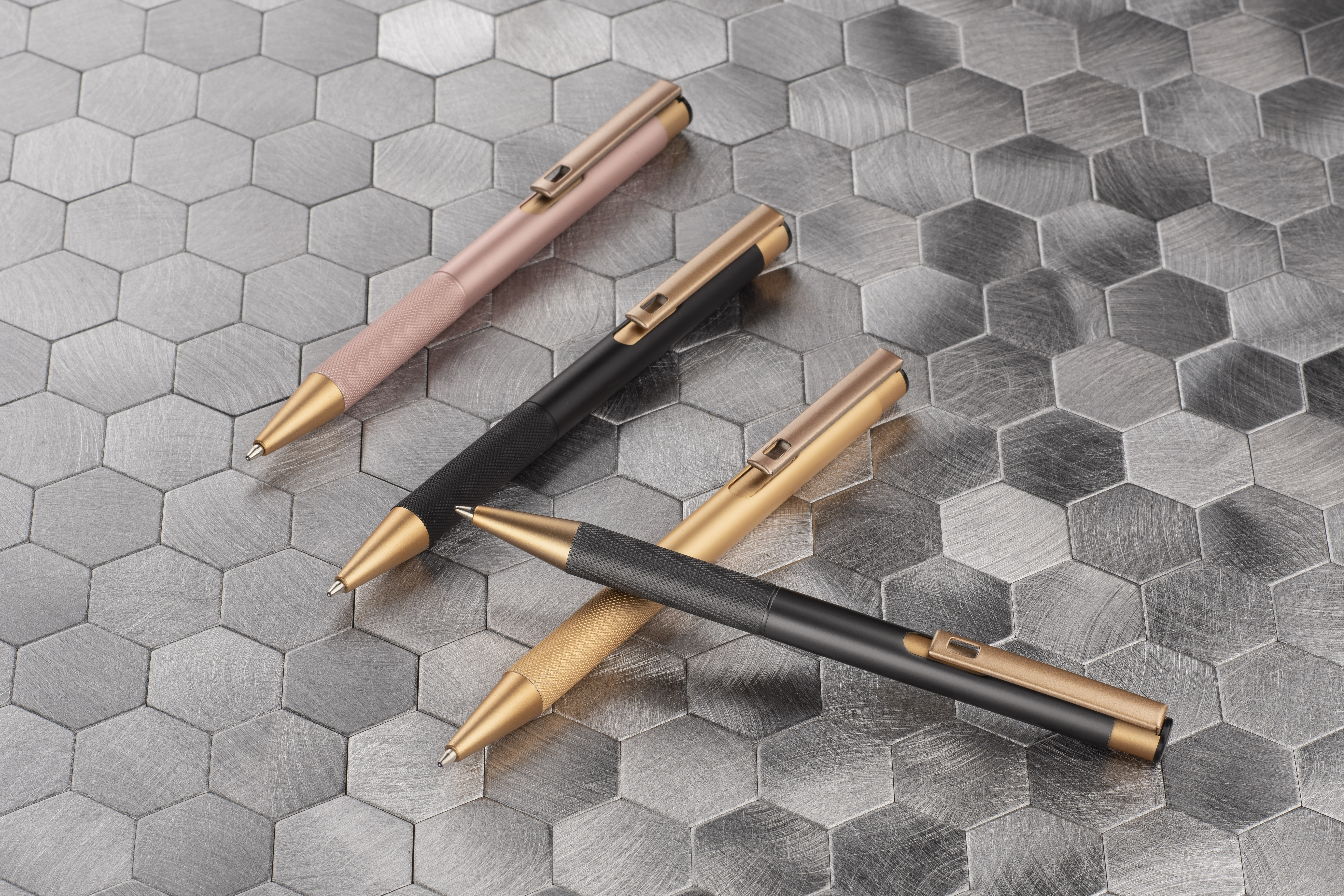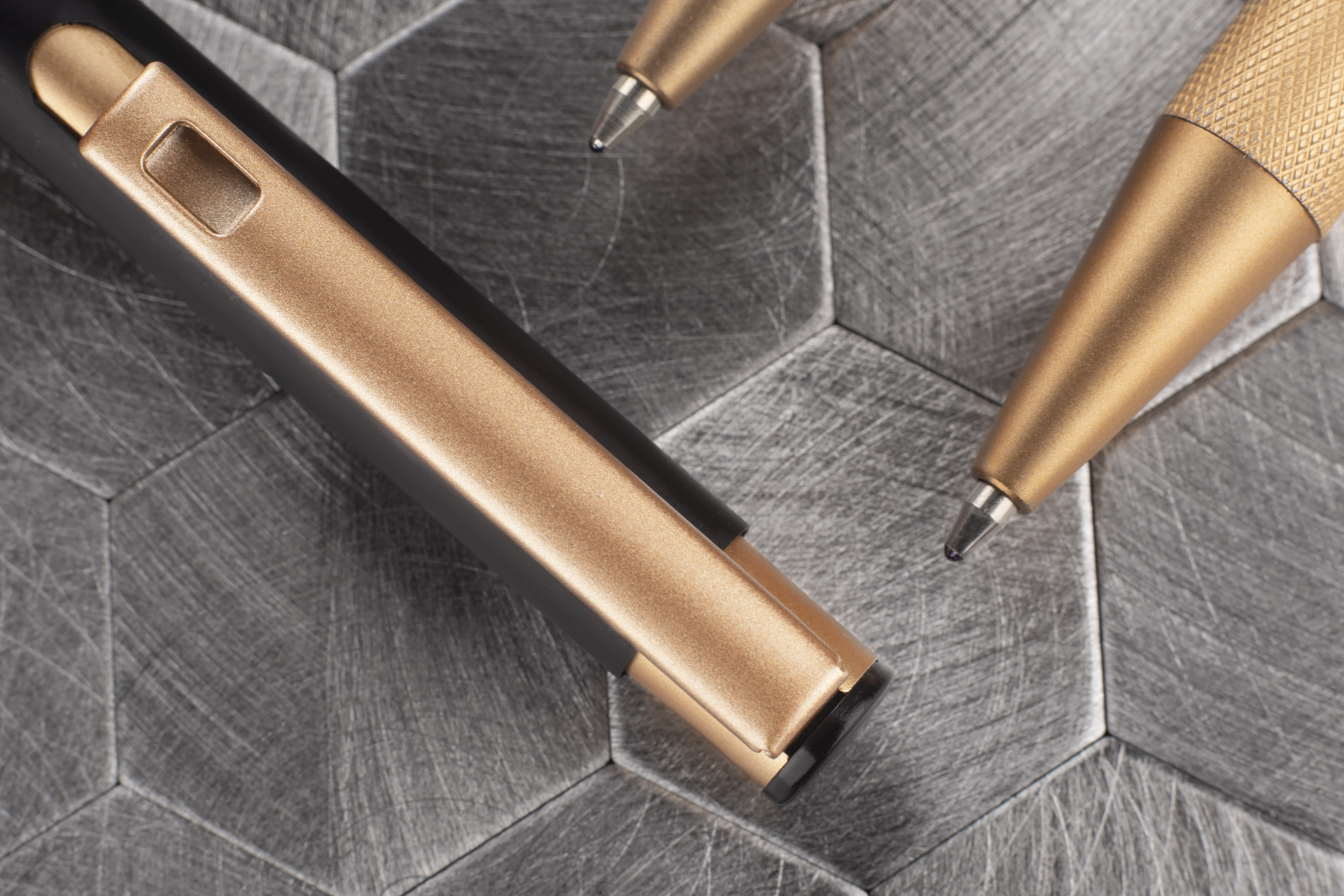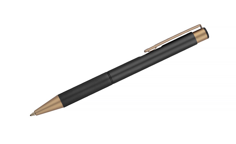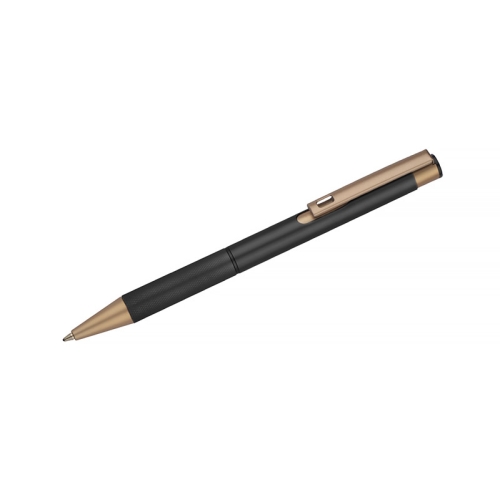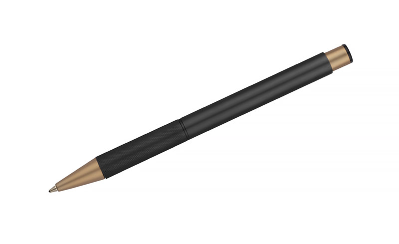 Elegancki aluminiowy długopis. Wykończenia w kolorze złotym. Wkład półżelowy w kolorze niebieskim.