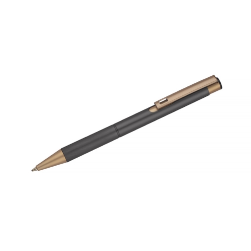 Elegancki aluminiowy długopis. Wykończenia w kolorze złotym. Wkład półżelowy w kolorze niebieskim.