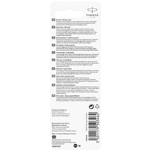 Gel ballpoint pen refill that is designed to fit in all Parker ballpoint pens and offers an alternative writing sensation with a silky-smooth finish. The refill has a writing length of 2500 meter and a nib size of 0.7mm (medium). Packaged on a blister card.