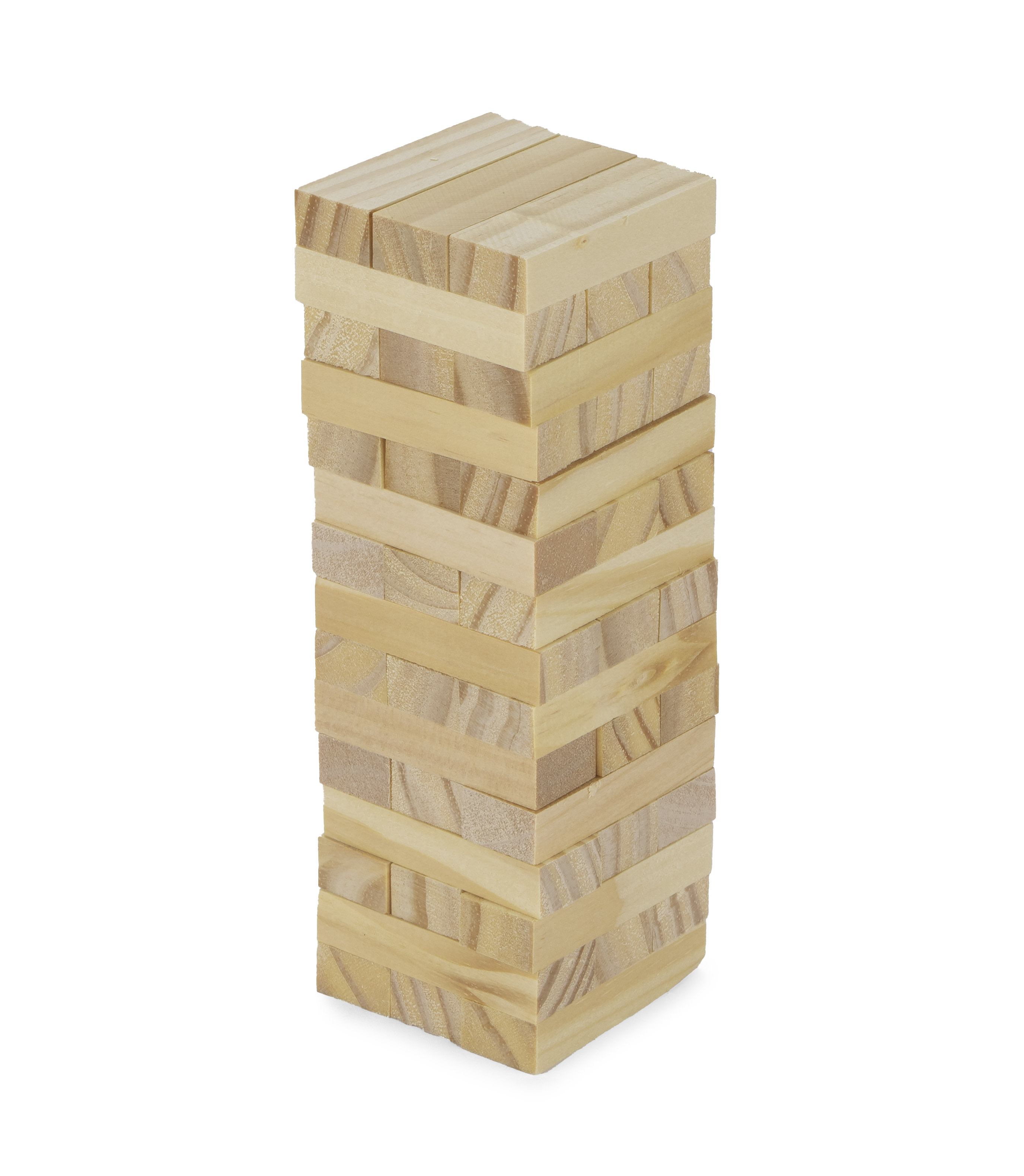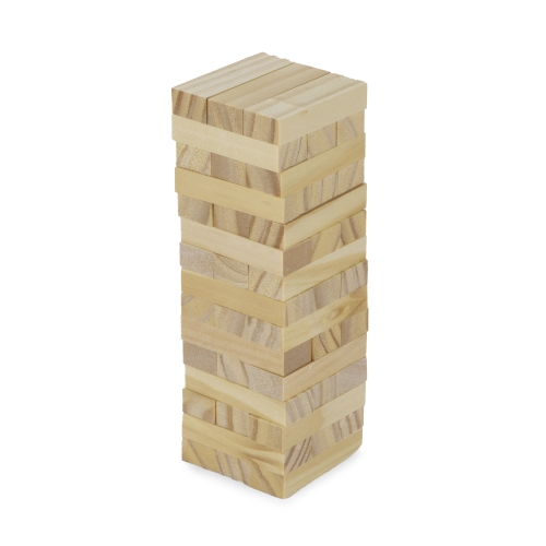 Gra zręcznościowa BRICKS wykonana z sosnowego drewna posiada 45 klocków zapakowanych w brązowy kartonik. Do zestawu dołączono ściągany sznurkami woreczek z tworzywa non-woven.