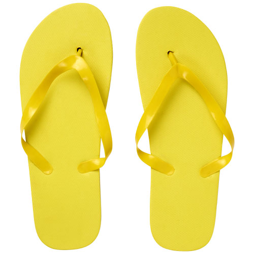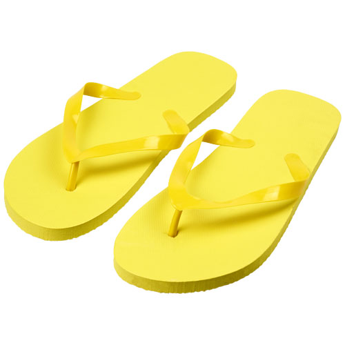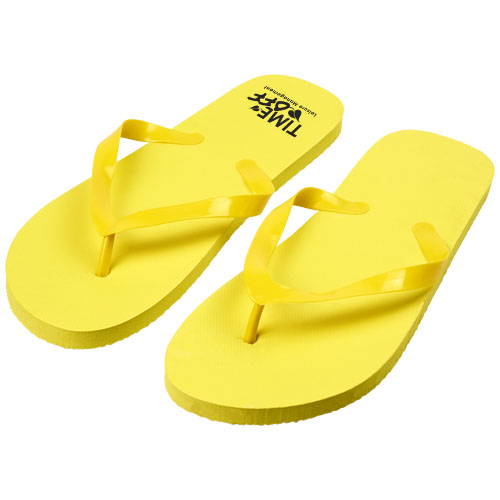Klapki plażowe Railay (M). Zestaw wygodnych klapek plażowych w szerokiej gamie kolorystycznej z podeszwą polietylenową i paskiem z PCV. Dostarczane w dwóch różnych rozmiarach: M 36-38 i L: 42-44.Jest to sprawdzone rozwiązanie w sezonie letnim. Ze względu na charakter i zastosowanie produktu, każde użyte logo narażone jest na zużycie. Polietylen.