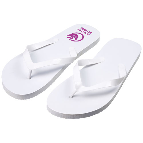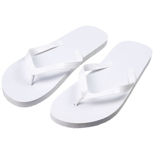 Klapki plażowe Railay (L). Zestaw wygodnych klapek plażowych w szerokiej gamie kolorystycznej z podeszwą polietylenową i paskiem z PCV. Dostarczane w dwóch różnych rozmiarach: M 36-38 i L: 42-44.Jest to sprawdzone rozwiązanie w sezonie letnim. Ze względu na charakter i zastosowanie produktu, każde użyte logo narażone jest na zużycie. Polietylen.