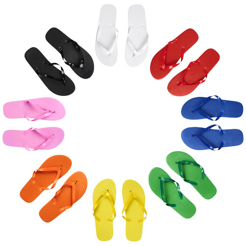 Klapki plażowe Railay (L). Zestaw wygodnych klapek plażowych w szerokiej gamie kolorystycznej z podeszwą polietylenową i paskiem z PCV. Dostarczane w dwóch różnych rozmiarach: M 36-38 i L: 42-44.Jest to sprawdzone rozwiązanie w sezonie letnim. Ze względu na charakter i zastosowanie produktu, każde użyte logo narażone jest na zużycie. Polietylen.