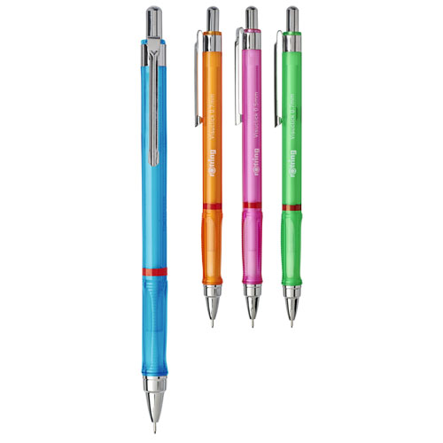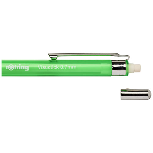 Ołówek automatyczny Visuclick (0,7 mm). Wciskany automatyczny ołówek do dynamicznego pisania i szkicowania. Wyposażony w metalowy mechanizm z chowanym posuwem grafitu. Trójkątny uchwyt dla wygodnego użytkowania. Wysuwana końcówka, w środku wysokopolimerowe wkłady o twardości 2B Rozmiar stalówki: 0,7mm. ABS tworzywo sztuczne.