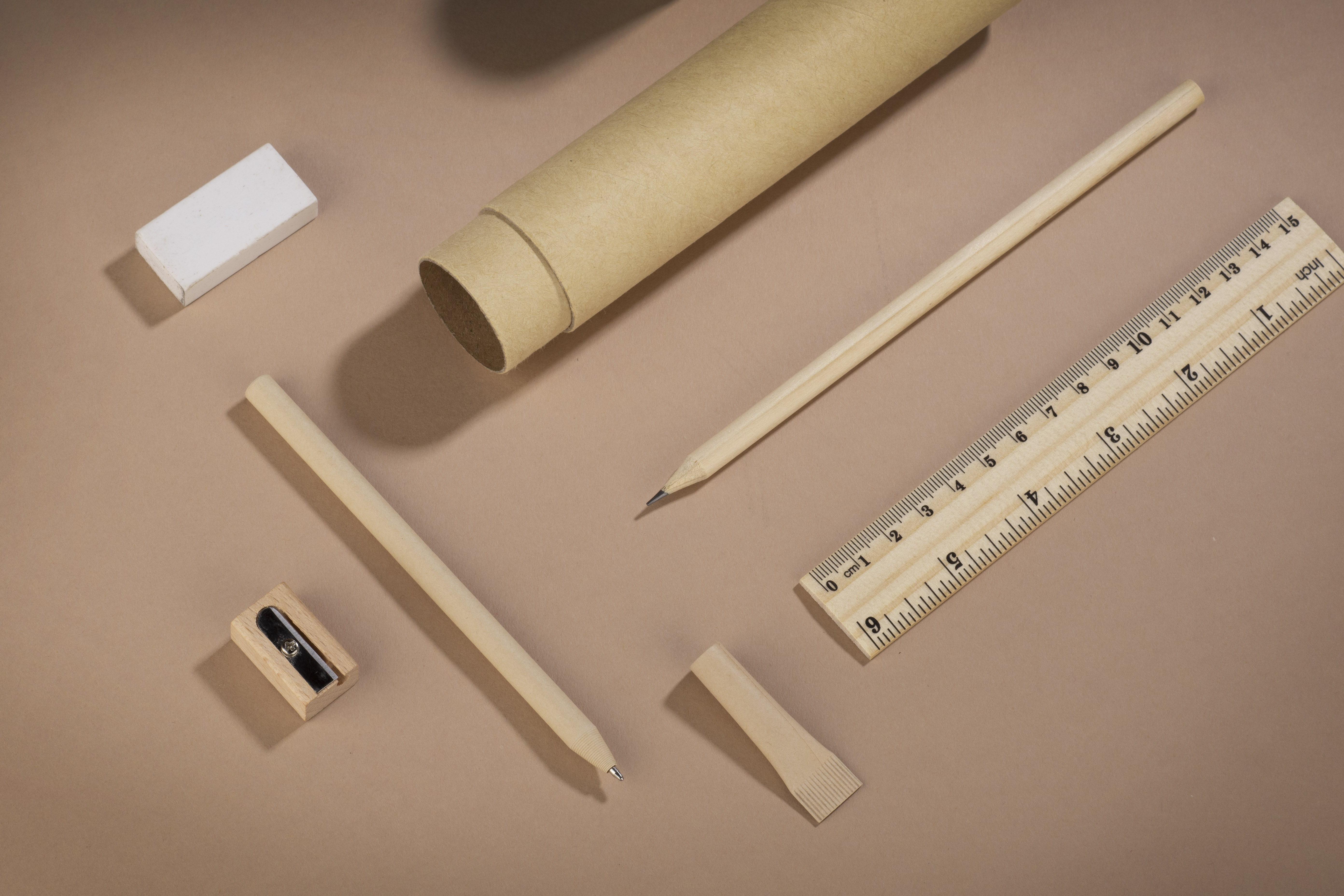 Piórnik ekologiczny wykonany z kraftowego papieru w kształcie tuby. W zestawie: papierowy długopis, drewniany: ołówek, temperówka, linijka oraz gumka do mazania.