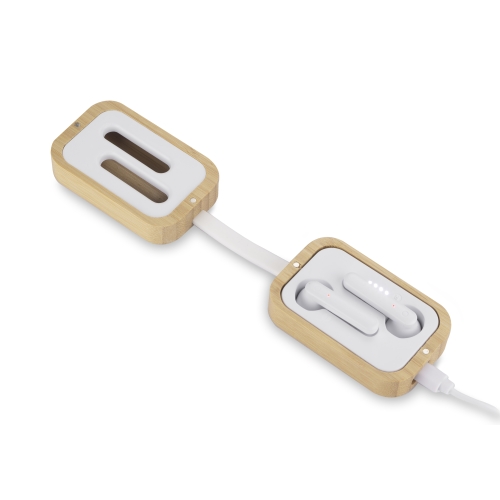 Słuchawki bezprzewodowe BAHO są obudowane w bambusowe etui zamykane magnetycznie. Dzięki swej ciekawej i nietypowej formie nikt nie przejdzie obok nich obojętnie. Wyposażone są w wskaźnik naładowania dzięki czemu nigdy nie zaskoczy Cię niski poziom baterii w urządzeniu. Dotykowe sterowanie słuchawek zapewnia wygodę użytkowania. Słuchawki posiadają wbudowany mikrofon, co pozwala na prowadzenie rozmów. Możliwość używania tylko jednej słuchawki. Dane techniczne: wersja Bluetooth: V5.1, zasięg Bluetooth: do 10m, pojemność baterii w każdej słuchawce: 30 mAh, pojemność baterii w etui: 200 mAh, czas pracy do 3 godz., port ładowania typu-c.